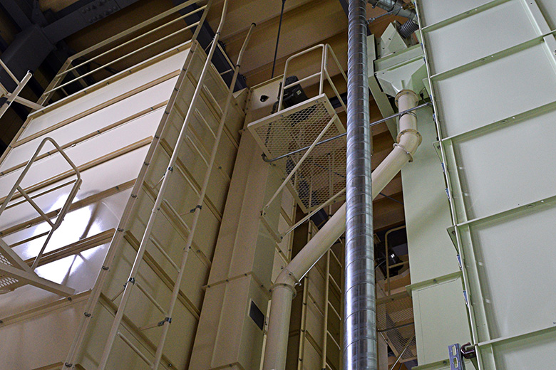 タンク一体型投込み式昇降機で投入。昇降機高を大幅に抑えられ、放冷タンクでの使用は乾燥機と同等の高さに抑えられます。