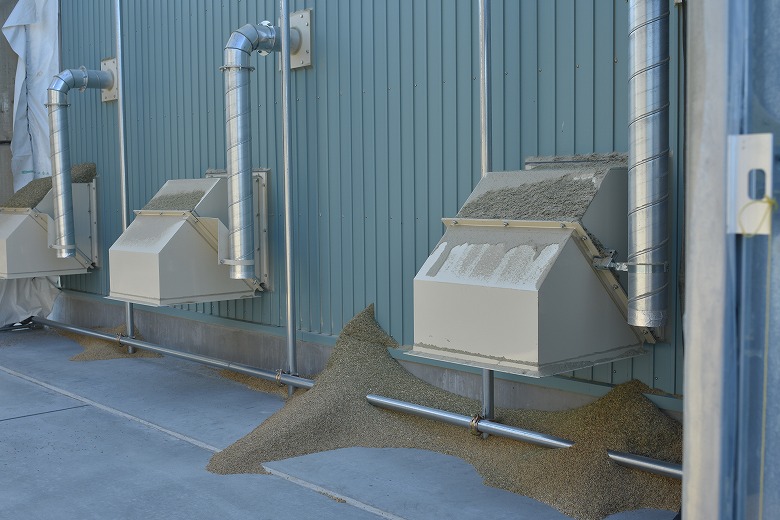乾燥機からの排塵は、建物裏に設置された集塵室へ送られます。
